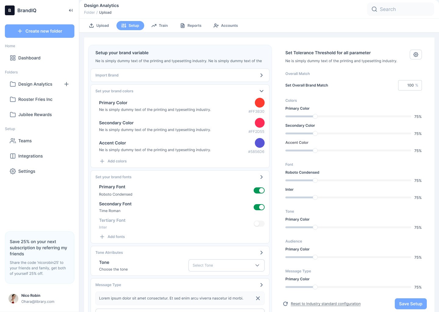 You set your brand guidelines and tolerances for colors, typography, logo usage, layout, and tone.